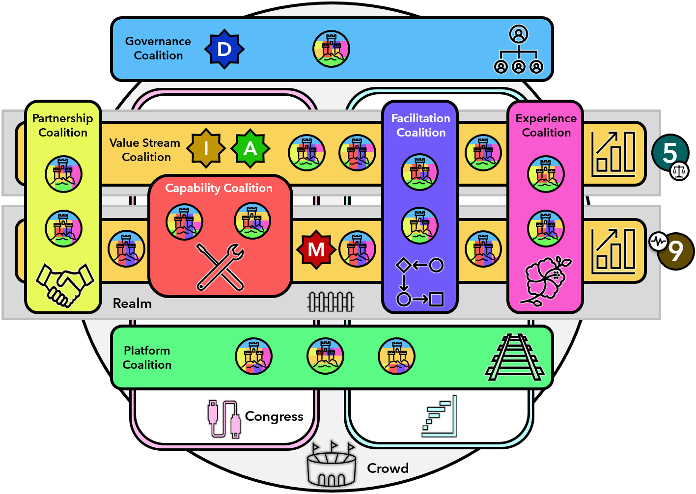 As coalizações normalmente consistem em três a sete Ligas. São, em grande medida, autônomos e auto-organizados. Dizemos “em grande medida” porque há sempre algumas restrições à auto-organização impostas por uma Coalização de Governança (também conhecida como a equipa de gestão da Conglomerado). As Coalizões podem ter autonomia para decidir sobre os seus próprios objetivos, processos, funções e membros. Eles são uma equipe com prazo determinado e com a missão de fazer algo.